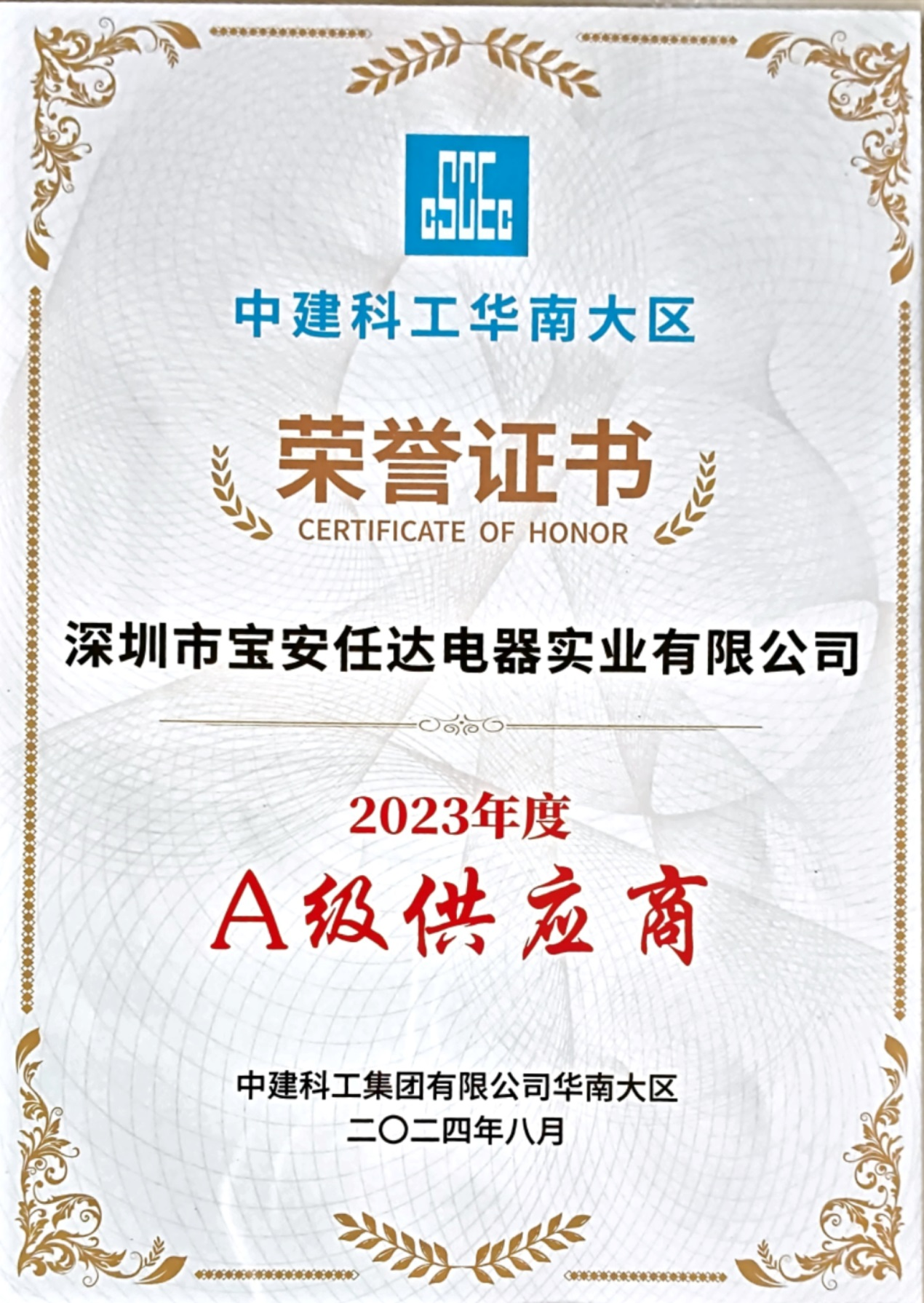 中建科工華南大區(qū)2023年度A級供應(yīng)商證書