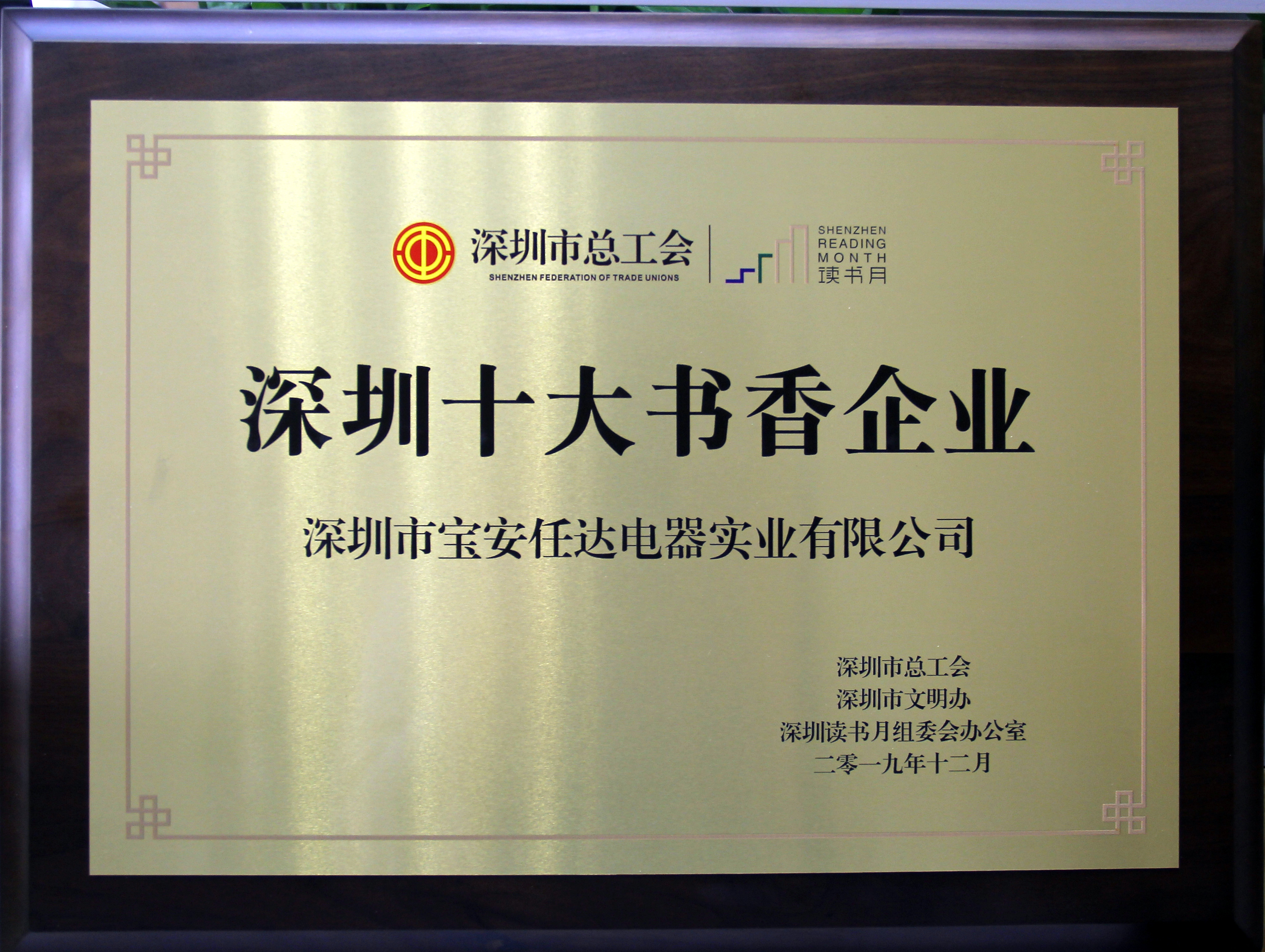 近日,在深圳市舉辦的“深圳十大書香企業(yè)”頒獎儀式上,深圳市寶安任達(dá)電器實(shí)業(yè)有限公司喜獲“深圳十大書香企業(yè)”榮譽(yù)稱號。